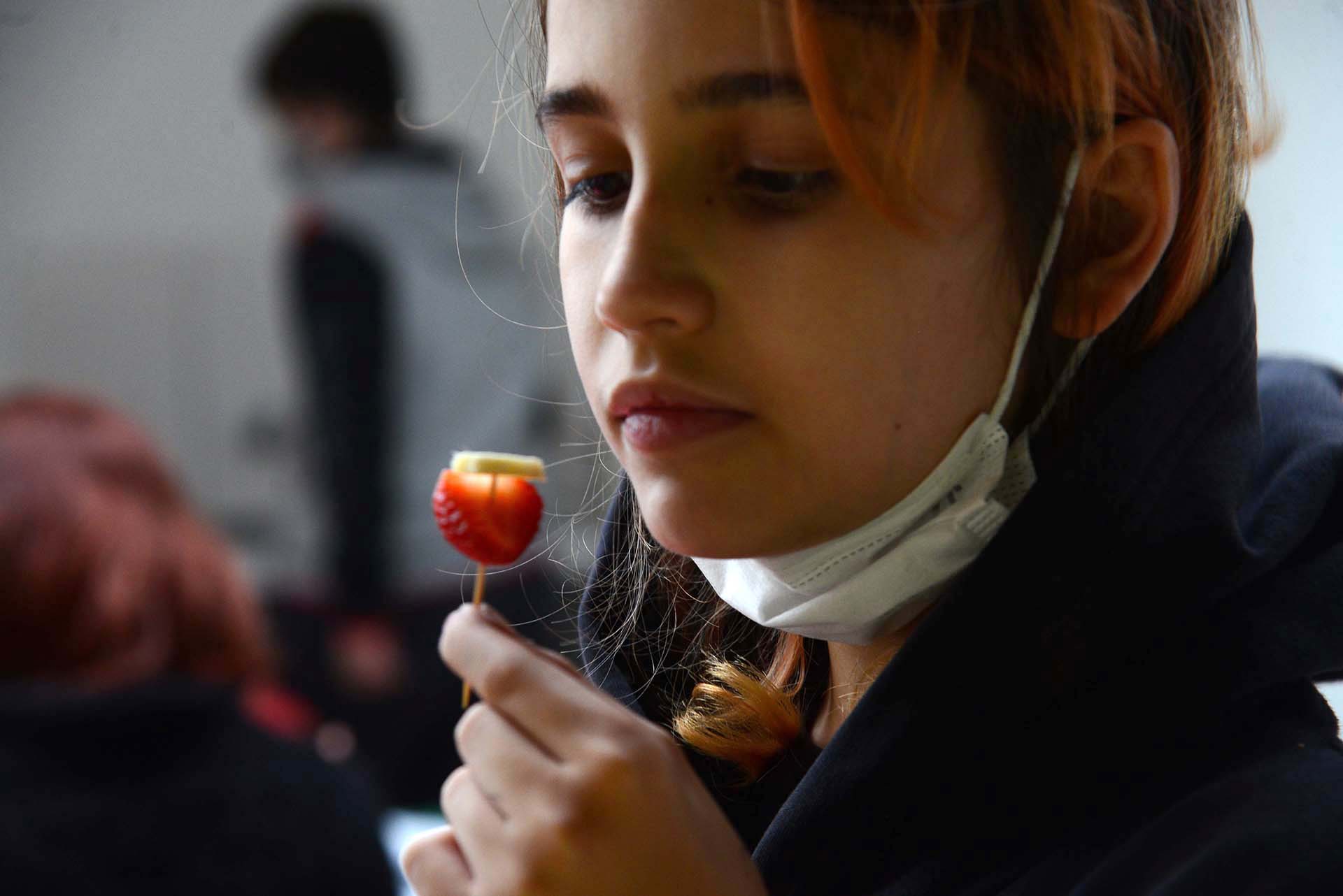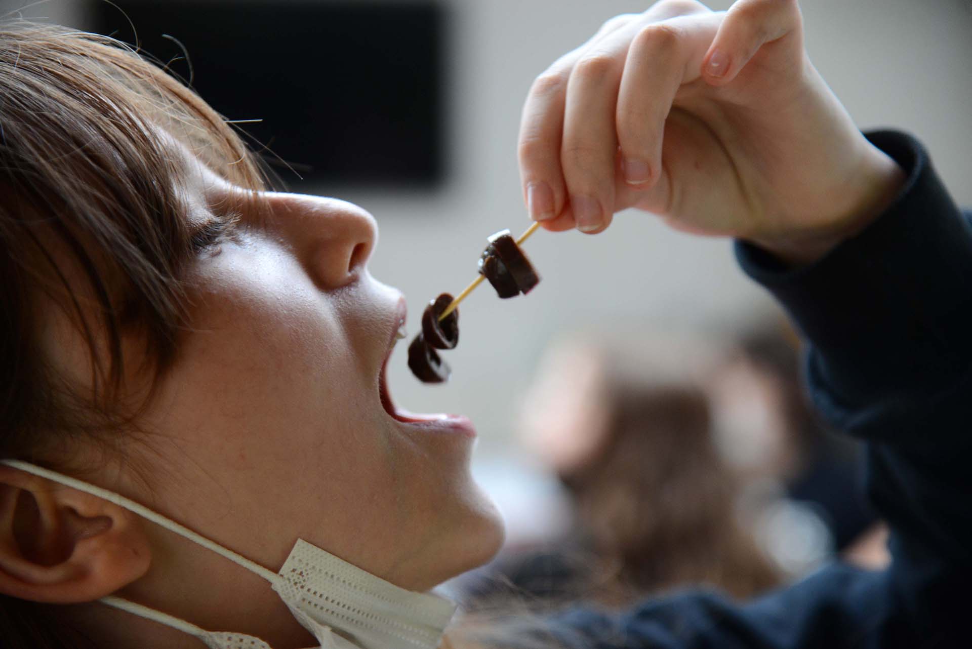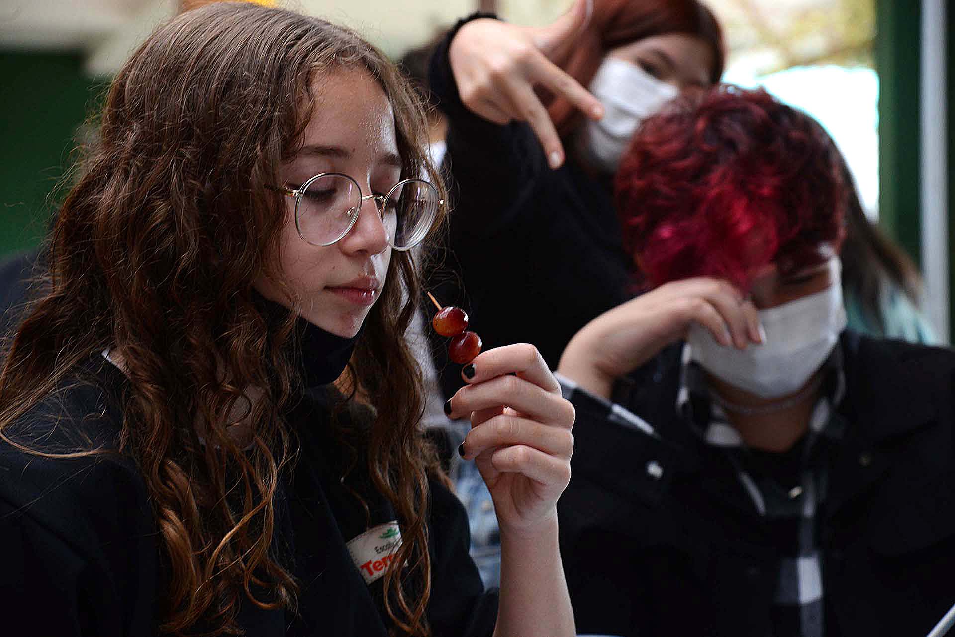 Para degustar, havia morangos, uvas, azeitonas, bananas, nozes, amêndoas e gengibre. Cada estudante foi instruído a sentir e identificar os paladares com bastante atenção, para depois definir seus componentes nutritivos. “A relação entre o gosto que experimentamos quando comemos e o nutriente que estamos consumindo já foi trabalhada em sala, assim como o processo digestório, suas fases e em qual delas se dá a absorção de cada tipo de substância”, explica a professora Cris.