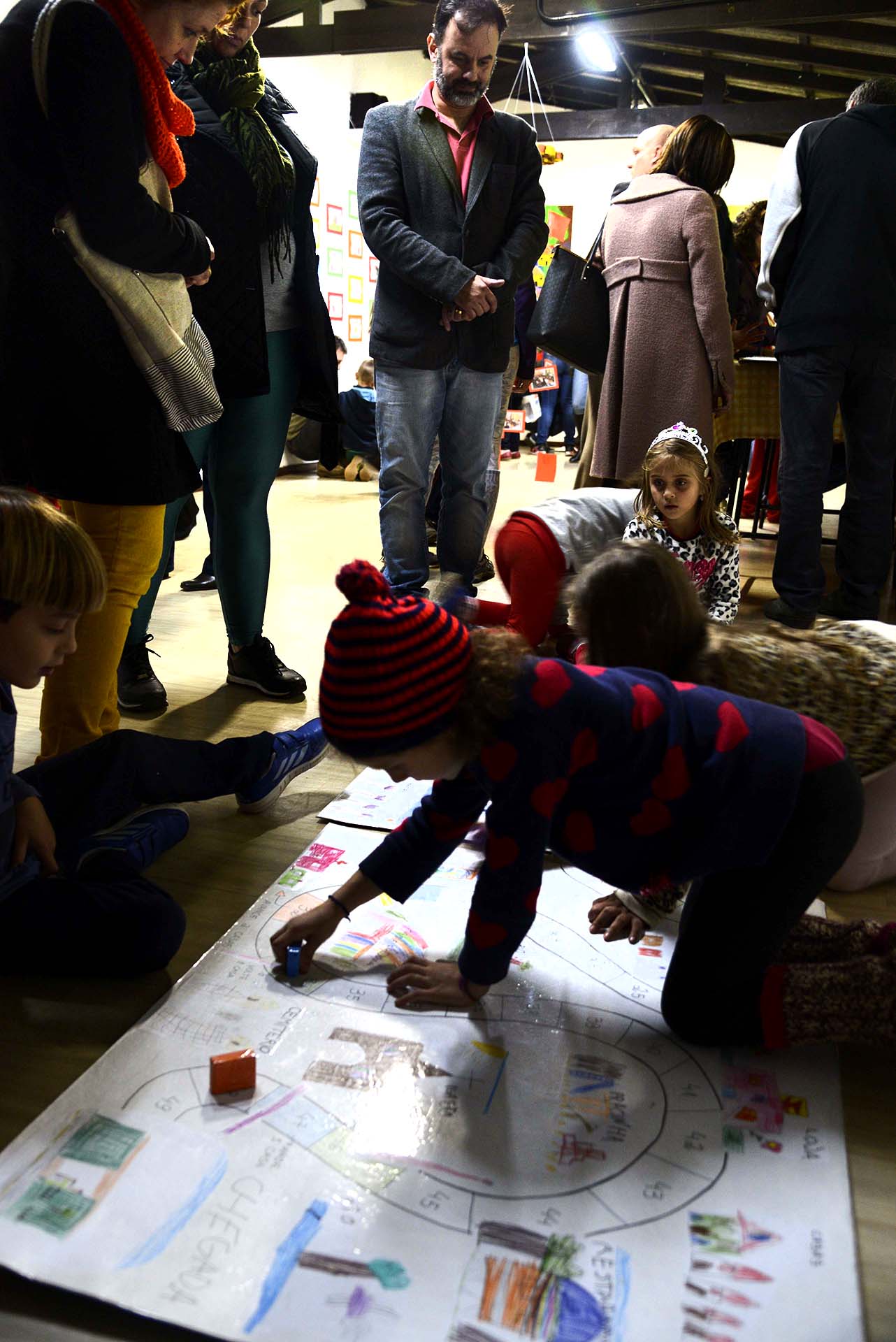 Depois de criarmos todo o esboço do jogo, começamos a construção propriamente dita: cada aluno desenhou um dos lugares previamente escolhidos para compor o tabuleiro. Criamos os “peões” utilizando caixinhas de fósforo, e demos vida a meios de transporte: patinete, helicóptero, trem, bicicleta etc. Pintamos os tabuleiros, colamos os locais desenhados, desenhamos o caminho, numeramos as casas e….BUM! Construímos um jogo inteirinho, com regras e utilizando tudo o que aprendemos no projeto.