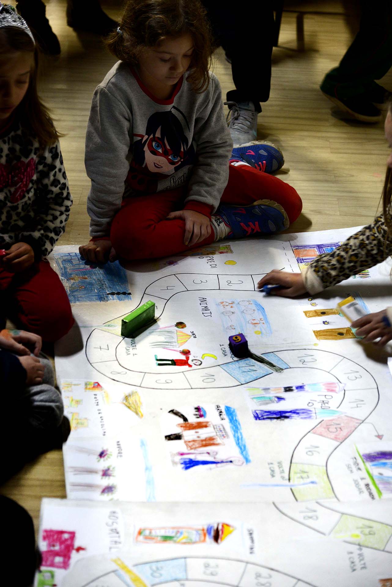 Em seguida, reunimos as duas turmas no pátio para criar um planejamento do jogo que construiríamos. Fizemos uma lista com todos os lugares que surgiram da lição de casa e que colocaríamos nele, como: casa assombrada, hospital, cemitério, loja, mercado e muitos outros. Demos sugestões de nomes para o jogo e votamos em um definitivo: Caminho Maluco. Também escolhemos consequências para algumas casas, como “avance uma casa” e “fique uma rodada sem jogar”.