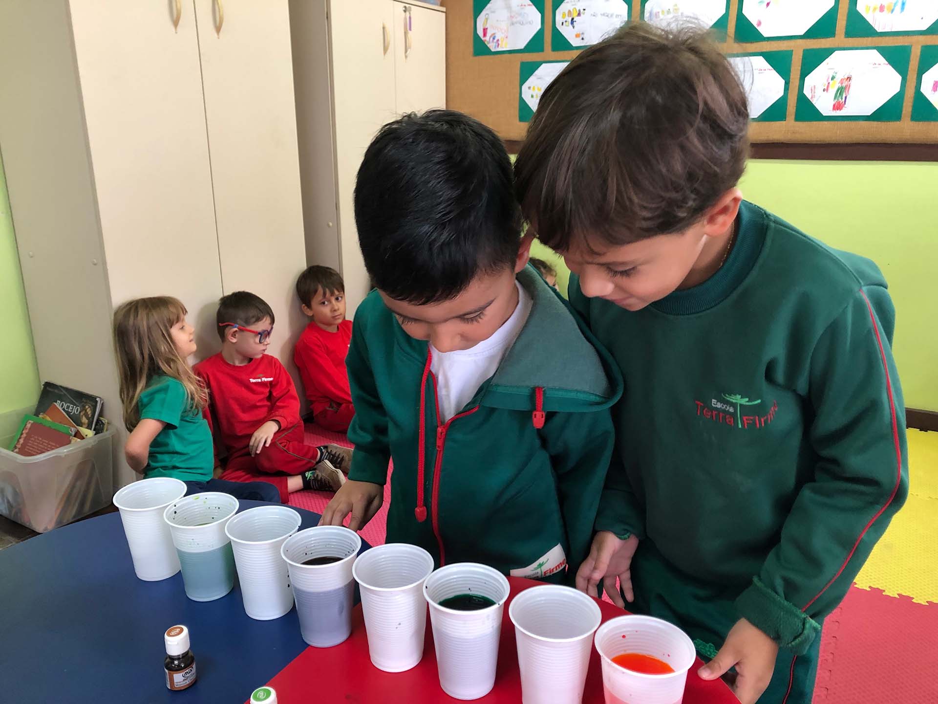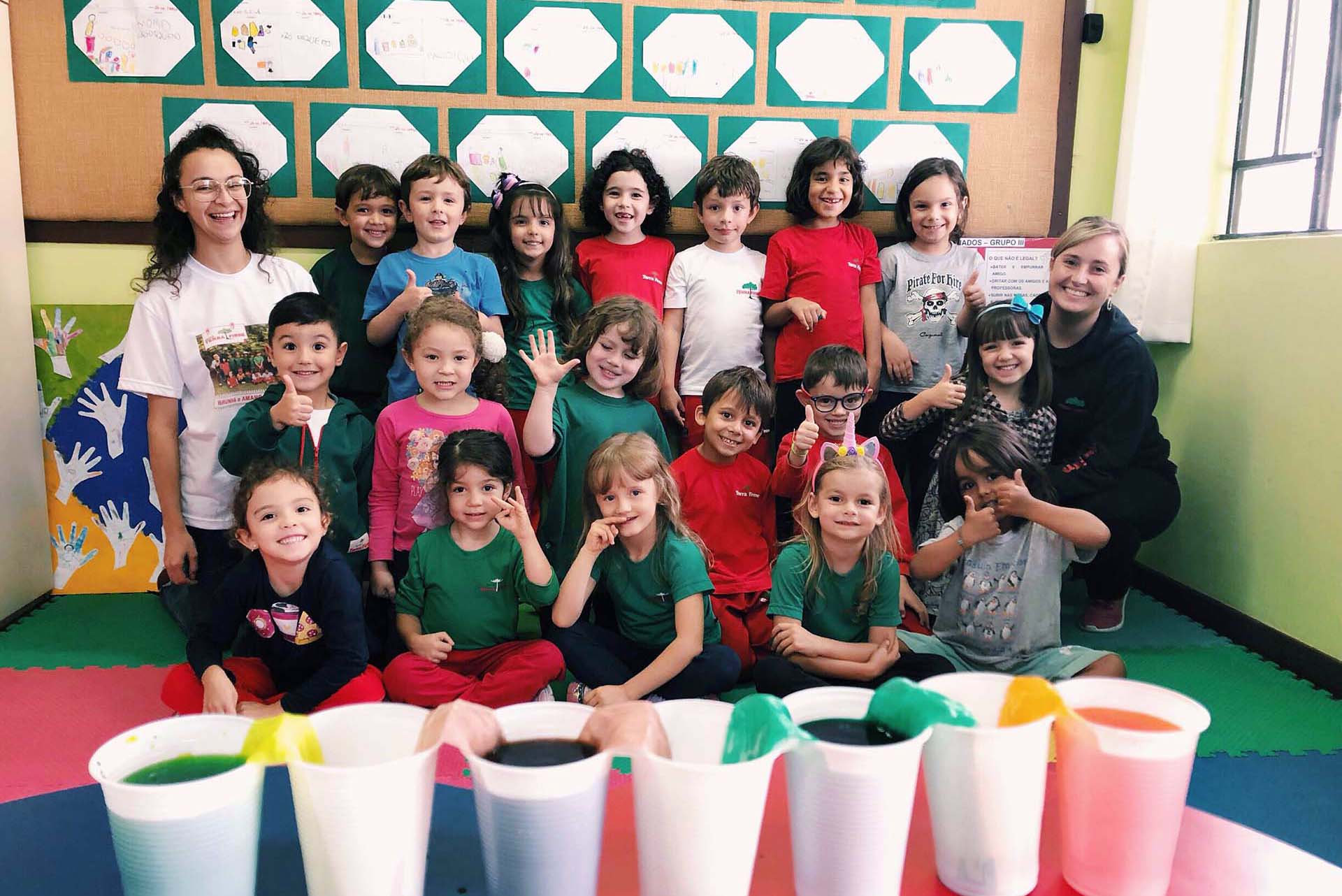 O discernimento e o reconhecimento das cores, bem como o processo de formação de matizes e tonalidades, é um dos temas importantes abordados na Educação Infantil. Na Escola Terra Firme, as professoras Bruna Bassetti Britto e Amanda Moutinho Alberti, do Grupo III; e Rosana Machado, a Rô, e Erli Freitas, a Lili, do Grupo I, desenvolveram estratégias pedagógicas criativas e divertidas, nas quais as crianças se empenharam ativamente na identificação das cores e nas descobertas acerca das transformações que estas sofrem quando em interação.