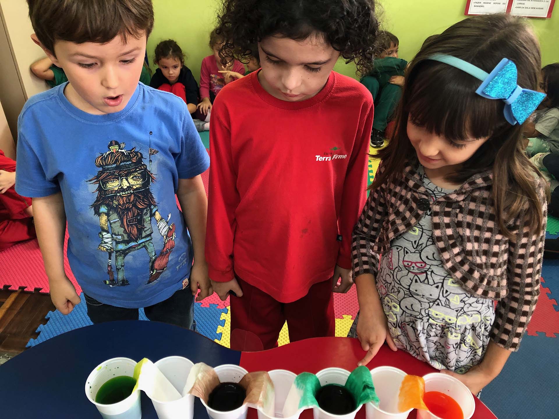 No Grupo III, a atividade evocou o Eixo Pedagógico da escola em 2019, “Pontes”, e foi realizada com copos, guardanapos, água e corantes. Alunos e alunas participaram da montagem do experimento e os copos foram enfileirados e, alternadamente, alguns foram enchidos com água e corantes, enquanto os demais foram mantidos vazios. Ligando os cheios aos vazios, foram postos guardanapos e o fascínio foi grande quando a água colorida começou a ser absorvida pelo papel poroso, formando pontes coloridas que transportaram a água com corantes para os copos vazios, formando novos matizes nestes. “As crianças gostaram muito, disseram que parecia mágica, aprenderam sobre as cores primárias e como se combinam para criar novas cores. O tema foi retomado em outras aulas”, disse a professora Bruna.