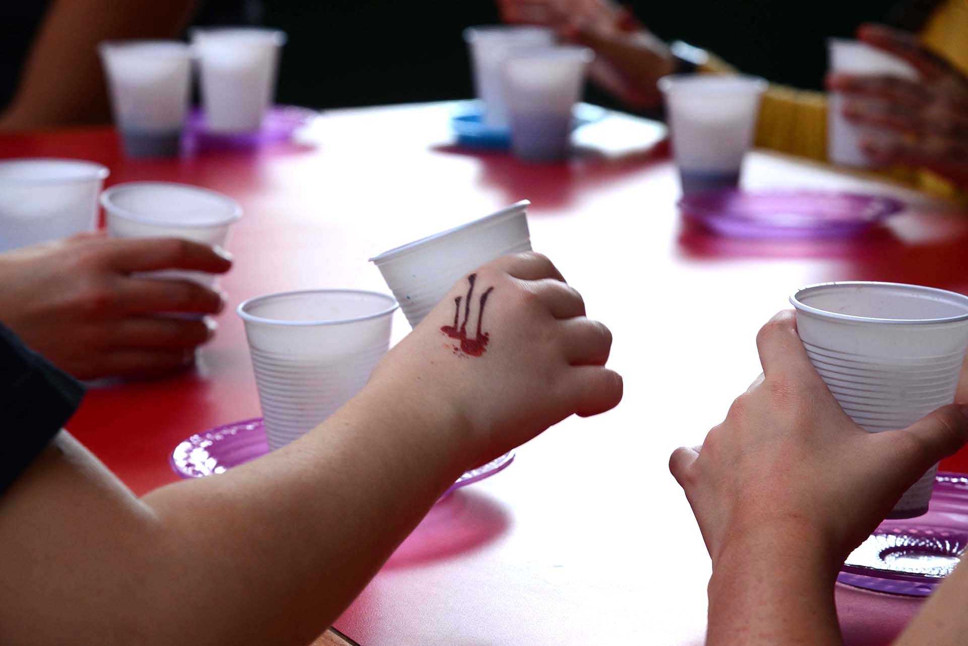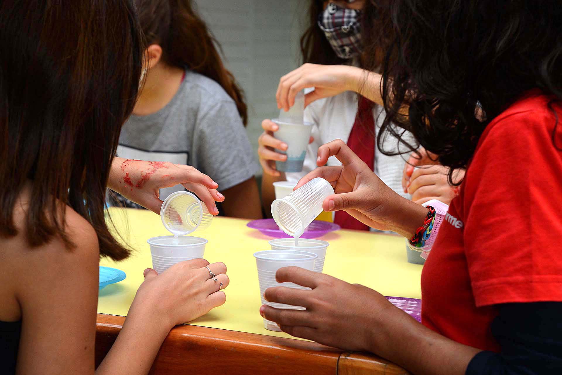 As práticas científicas começaram de forma lúdica, com a experiência do foguete e a do vulcão, utilizando substâncias que, juntas, formam uma reação química produzindo gás carbônico. Assim, alunos e alunas conheceram as propriedades do bicarbonato de sódio e do vinagre. Para o foguete, uma garrafa pet foi utilizada e a formação do gás carbônico em seu interior gerou o “combustível” para o lançamento. O foguete voou alto e o encantamento da turma foi visível. Na experiência do vulcão, a “erupção” foi colorida e vibrante, por conta da adição de corantes à água.