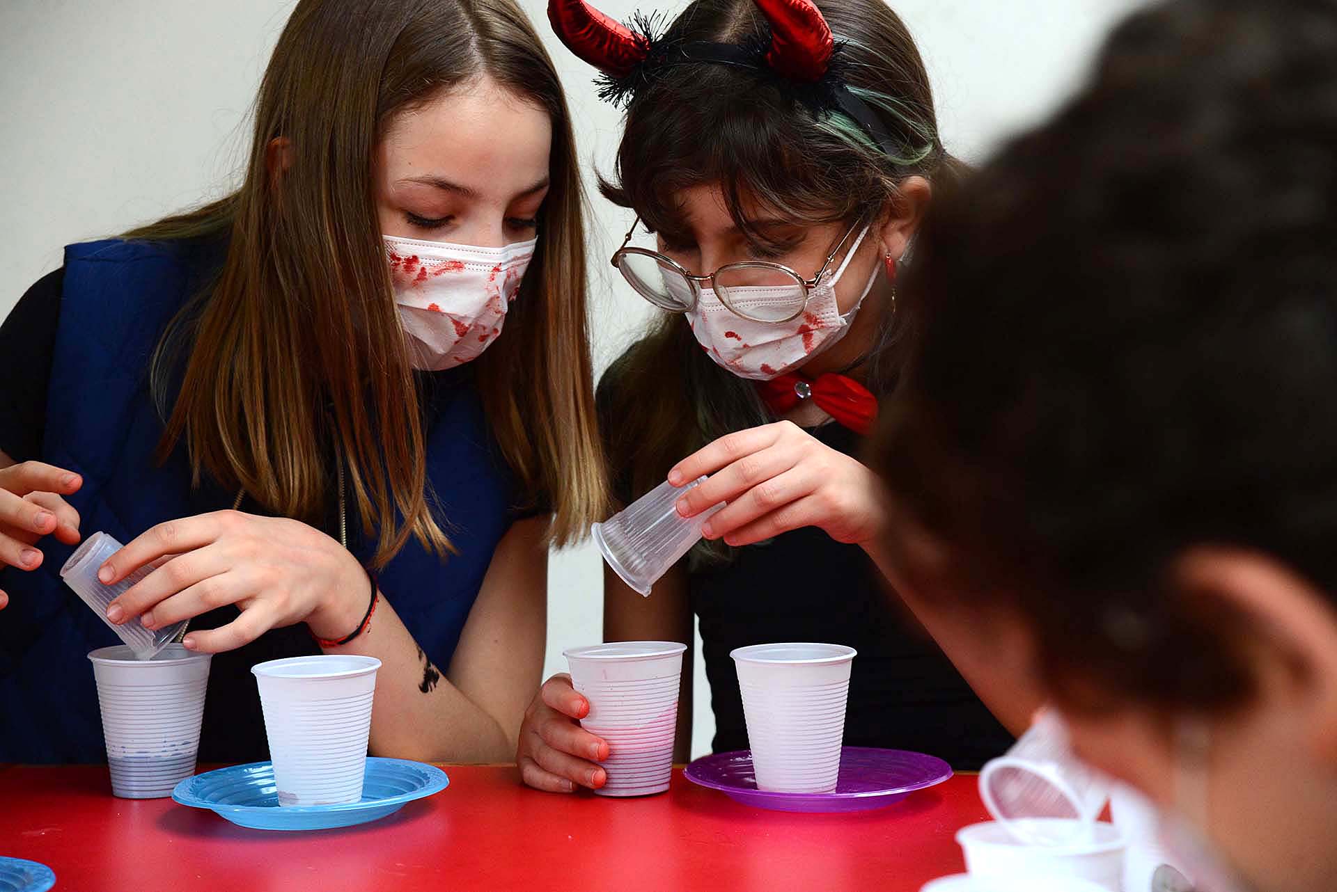 A turma do 5º ano, envolvida no projeto “Viajando pelo Mundo”, desenvolveu uma saudável curiosidade. Com a proposta de saber como as coisas são feitas e como funcionam, alunos e alunas demandaram à professora de Ciências, Fran Napoleão, conhecer as diversas possibilidades dessa área do conhecimento. Por conta disso, teve início uma série de experimentos para entender as reações químicas, o que são, como são e por que se dão. Em um deles, o estudo foi sobre as propriedades do bicarbonato de sódio e do vinagre que, juntos, produzem gás carbônico. Em outro, os objetos de estudo foram a água oxigenada e o fermento biológico, que também produzem o mesmo gás, quando combinados.