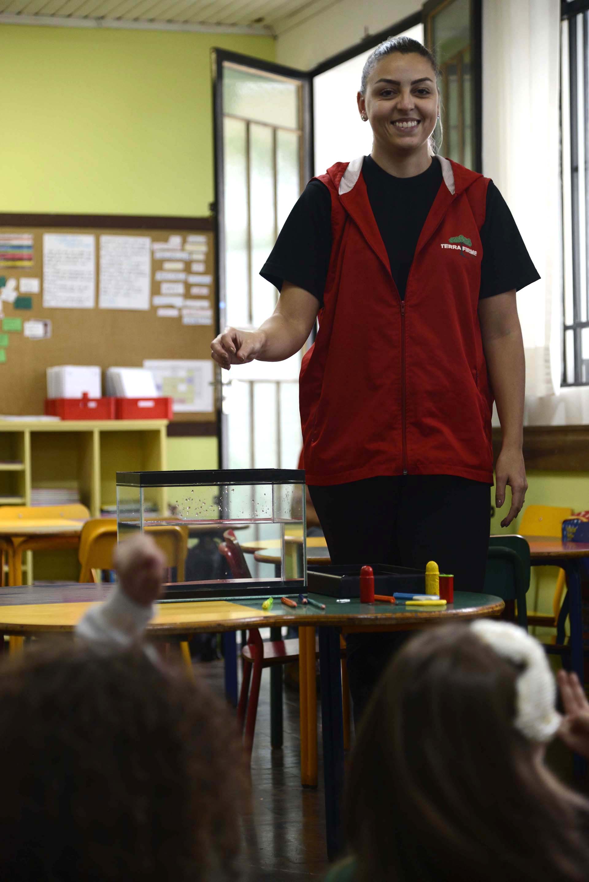 A professora Francesca Tockus, a Fran, comandou a aula de iniciação científica e, com a ajuda de um aquário e diversos objetos, pôde aproximar os alunos e alunas da noção de densidade por meio do conceito de peso. Tudo isso, é claro, com muita diversão, pois quando o pensamento conceitual é exercitado com alegria, tende a se desenvolver com mais efetividade. Segundo ela, “É importante estimular a procura do conhecimento e isso se pode fazer incentivando o aluno a experimentar para ir descobrindo como são e como funcionam as coisas”, diz. Ela explica que o fato das crianças terem, eles mesmos, realizado as experiências, facilitou tanto as explicações necessárias quanto, em decorrência, a compreensão.