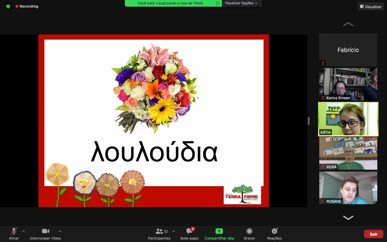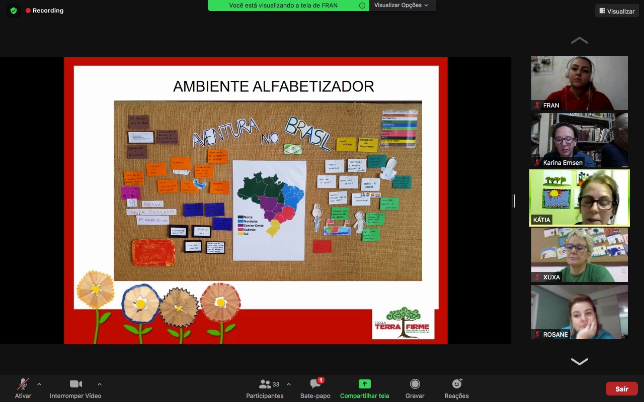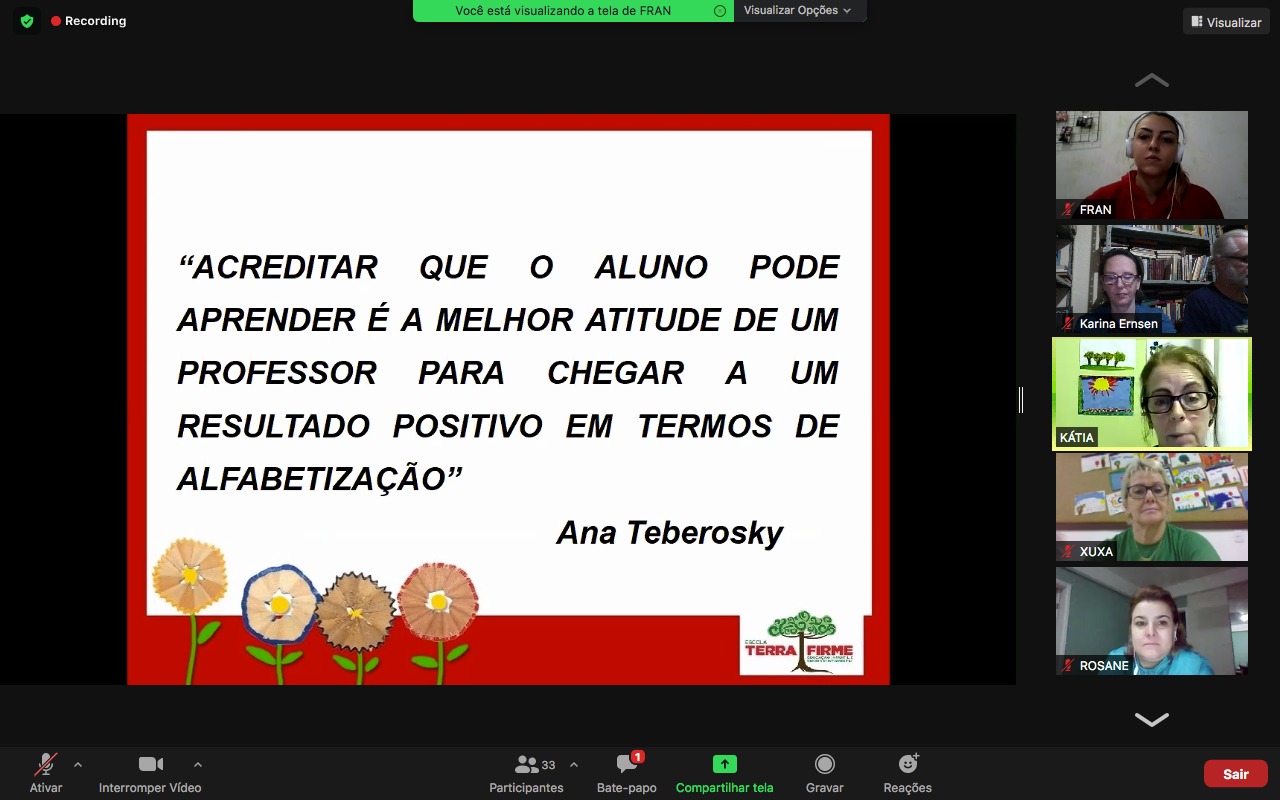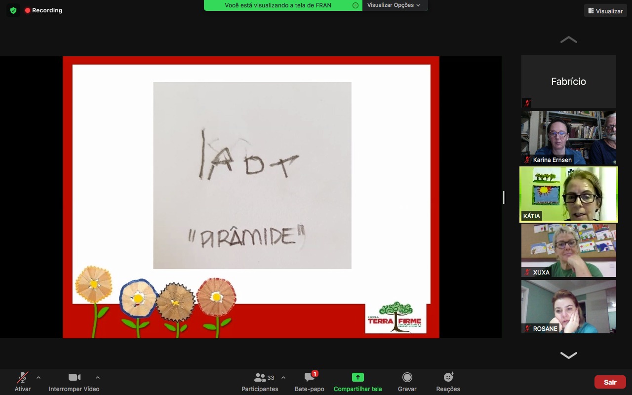 No dia 04 de março, pais e mães dos alunos e alunas do 1º ano participaram, em interação on line, da Oficina de Alfabetização da Escola Terra Firme. O objetivo foi envolver as famílias no processo de aprendizado da leitura e da escrita, vivenciado pelas crianças não apenas na escola, mas principalmente em casa, esclarecendo como se dão os passos em direção à alfabetização. A oficina propõe uma vivência singular aos familiares presentes, proporcionando que adultos relembrem o momento em tiveram o primeiro contato com as letras.