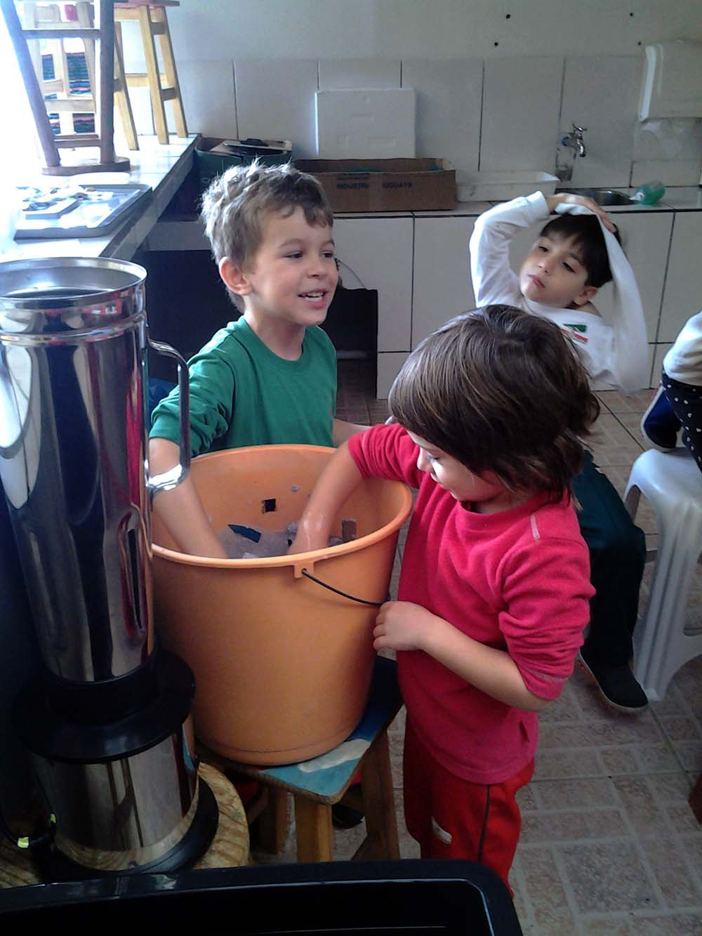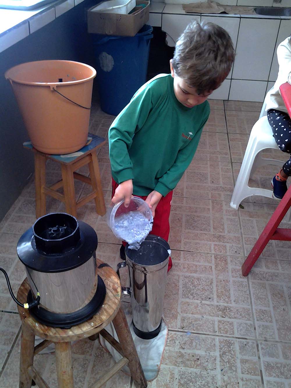 As aulas do Período Integral das professoras Carmynha e Rosana Machado, mais conhecida como Rô, começaram de forma diferente neste segundo semestre. As novidades foram o violão e o liquidificador industrial, duas conquistas dos alunos em uma experiência na qual o aprendizado foi além do adquirido no estudo curricular da botânica. Incluiu, ainda, trabalho artesanal com material reutilizável e a oportunidade de gerenciar um negócio sustentável, que lhes permitiu adquirir os bens que mais desejavam e de que mais necessitavam. Um bom e didático exemplo da construção do conceito de consumo consciente.