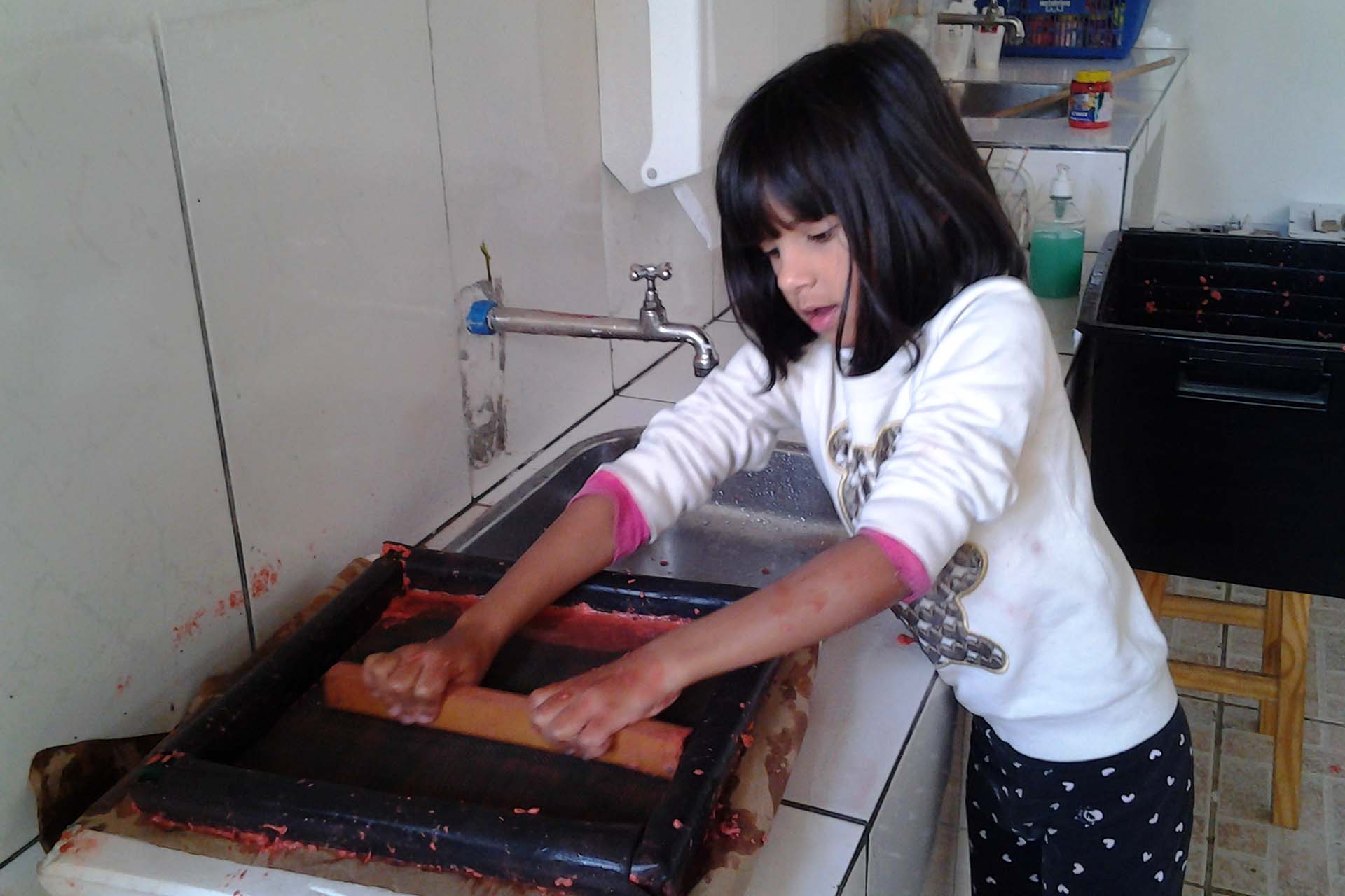 Mas, já no ano passado, não tinha mais onde colocar tanta mudinha e, ao mesmo tempo, a turma sentiu necessidade de um liquidificador industrial para produzir papel reciclado. Daí nasceu a ideia de vender as mudas, porém não simplesmente as mudas, mas elas transformadas em peças de artesanato, em sinergia entre o natural e o cultural. Tanto a Carmynha, como a Rô e até mesmo os alunos, começaram a trazer materiais que poderiam ser reutilizados, como janelas, portas, entre outros. E disso nasceram várias obras de artesanato que foram vendidas na feira “Nós da Terra”, evento no qual a comunidade Terra Firme (pais, mães, professores e alunos) expõe seus produtos e serviços. E, com o resultado das vendas, compraram o liquidificador.
