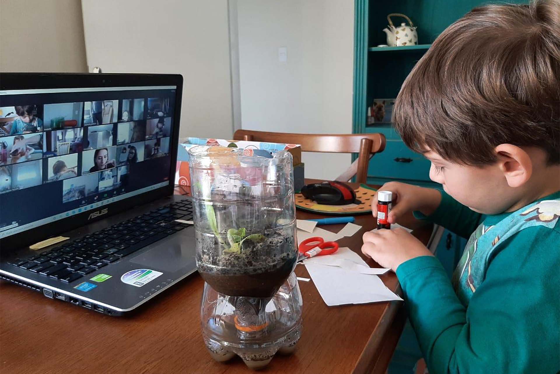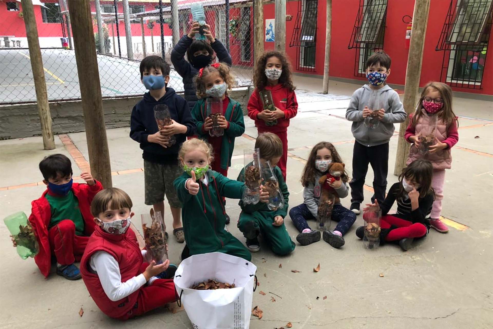 Com recipientes de vidro, foi feito um xilofone, utilizando água com tinta em diferentes níveis e latas foram reaproveitadas para a turma criar mini-hortinhas de temperos. As crianças que assistiam a aula em casa fizeram belos “porta-trecos”. E a aventura não ficou por aí. “Com os alunos do presencial fomos à estufa, pusemos terra nas latas e plantamos as mudinhas dos temperos. Por último, trabalhamos o lixo orgânico, todo o ciclo da matéria orgânica, como acontece o processo e como podemos reaproveitar, já que não podemos mandar os restos de alimentos para reaproveitamento nas indústrias. Então, fizemos minicomposteiras, para reaproveitamento de materiais básicos, como cascas de frutas”.