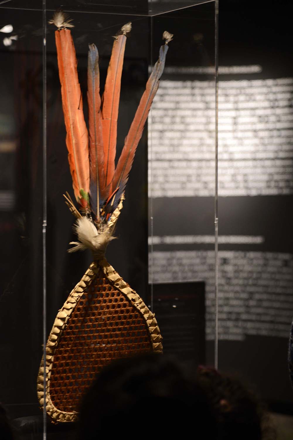 Grinalda Cobre Nuca “Myahara”, da etnia Rickbatsa, também conhecidos como Orelhas de Pau, Canoeiros, que vivem na bacia do Rio Juruena/MT. Adorno produzido com plumas de araras e mutum cavalo, cabelos humanos, tinta vegetal, cordéis de algodão e breu.